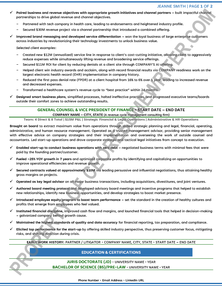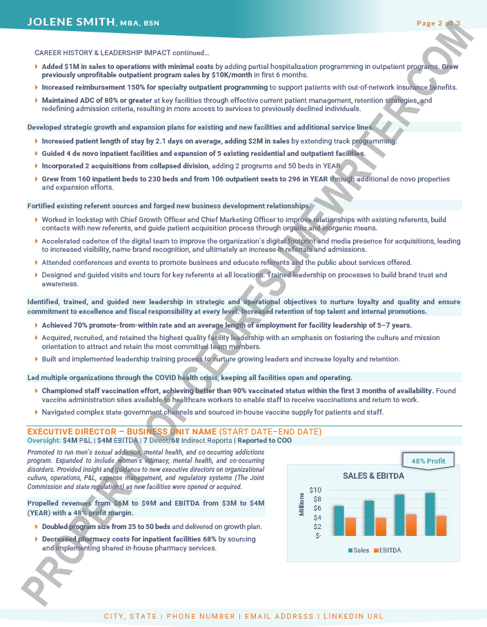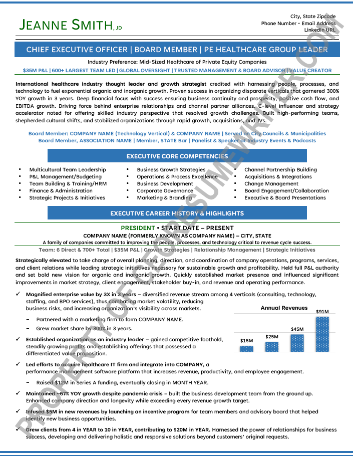 Written for a senior executive seeking a position as a Chief Executive Officer/CEO, or Chief Operations Officer/COO for private equity or venture capital-backed, healthcare technology companies. This sample executive resume was written with an emphasis on helping startups and healthcare services companies drive revenue.