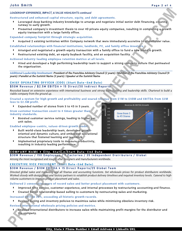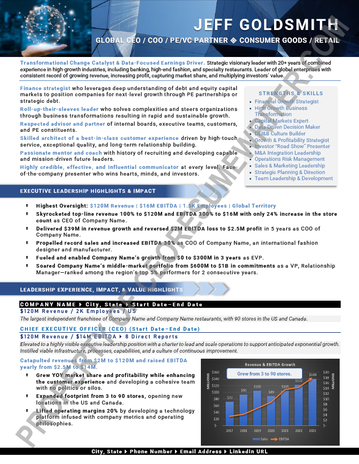Example executive resume written for a senior executive seeking a position as a Global Chief Executive Officer/CEO or COO. This executive resume sample is geared towards high-growth industries in the consumer goods / retails industry with an emphasis on private equity / venture capital.