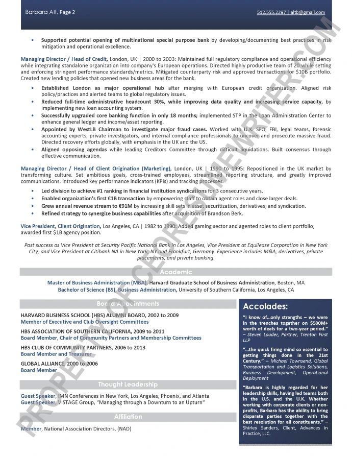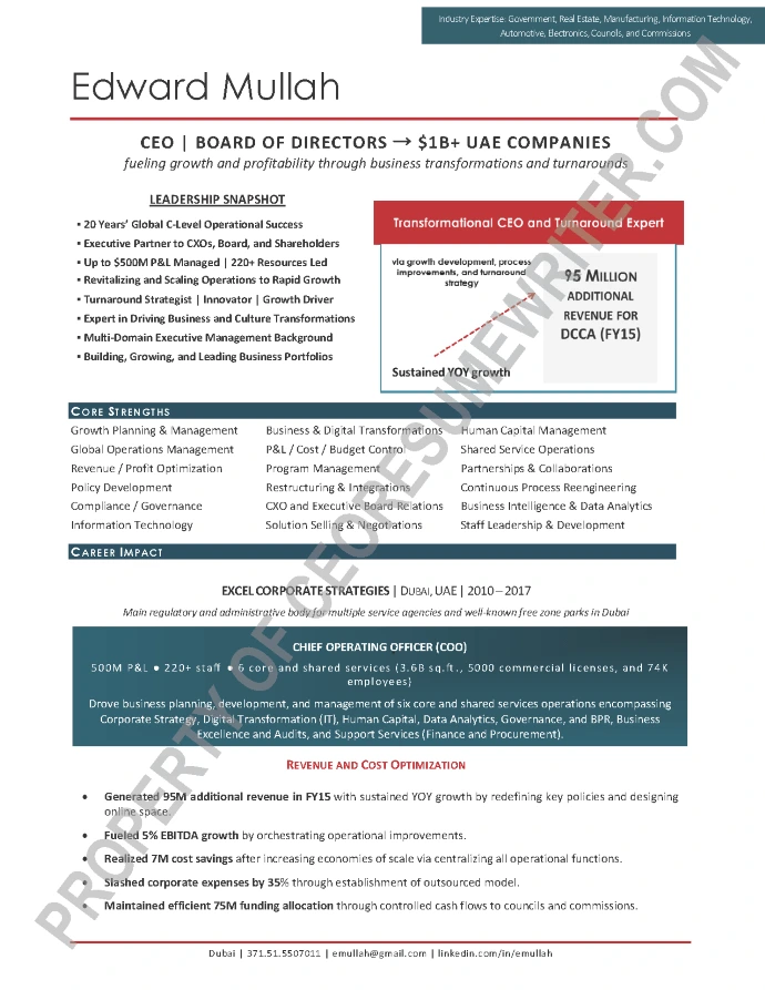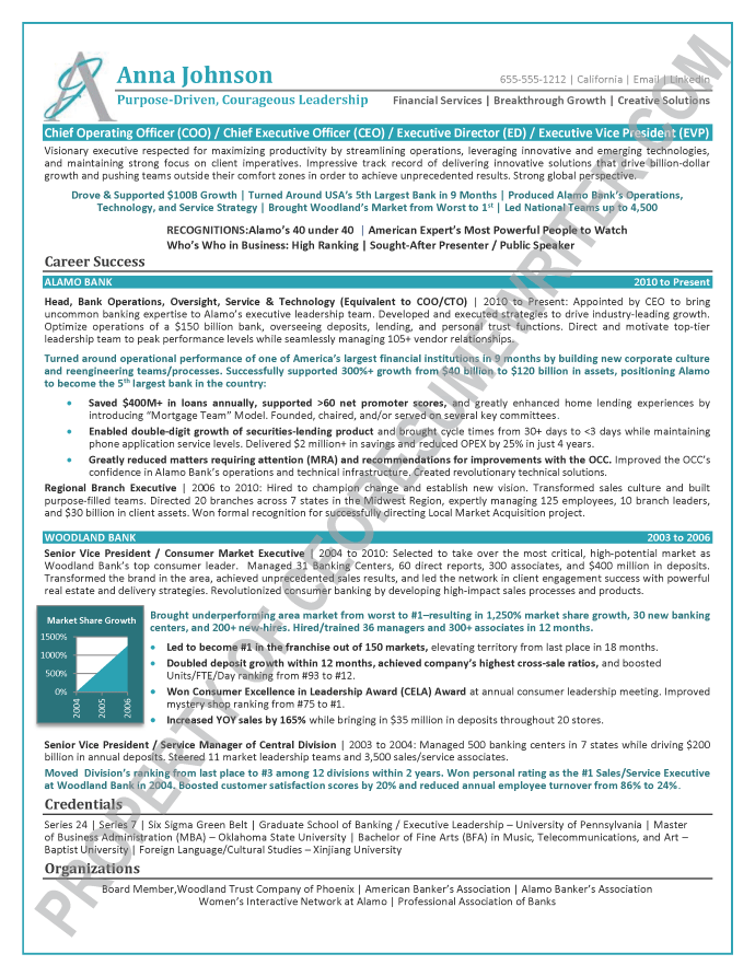 Written for a senior executive seeking a position as a Chief Executive Officer/CEO, or Chief Operations Officer/COO, Executive Director and Executive Vice President roles for major, multi-billion-dollar banking, finance, fintech and financial services companies. This executive resume example was written with an emphasis on leveraging emerging technologies and thought leadership in banking and finance.
