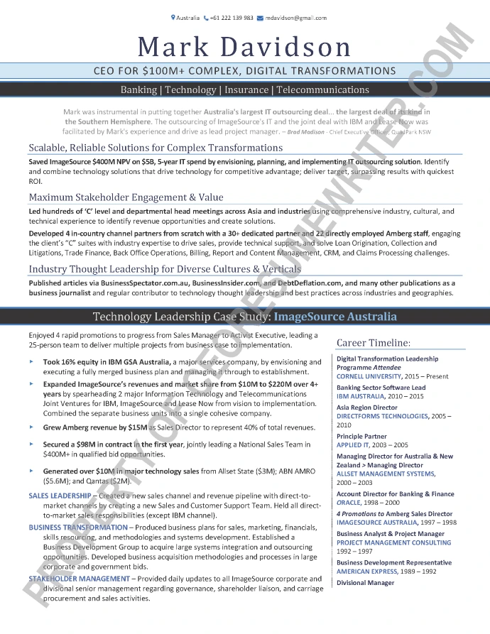 Written for a senior executive seeking a position as a Chief Executive Officer/CEO, or President for high growth technology companies and IT services companies. This sample executive resume was written with an emphasis on private equity consulting, Mergers & Acquisitions/M&As and corporate growth optimization.
