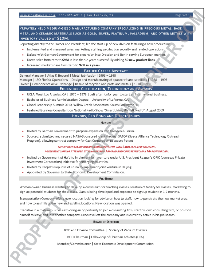 Written for a senior executive seeking a position as a Chief Executive Officer (CEO), or President for the high-tech manufacturing industry. This sample executive resume was written with an emphasis on private equity, Mergers & Acquisitions (M&As), turnarounds, global expansions and corporate growth optimization.