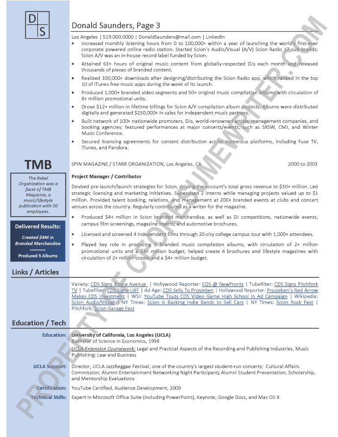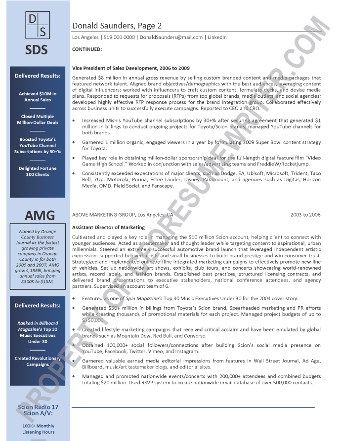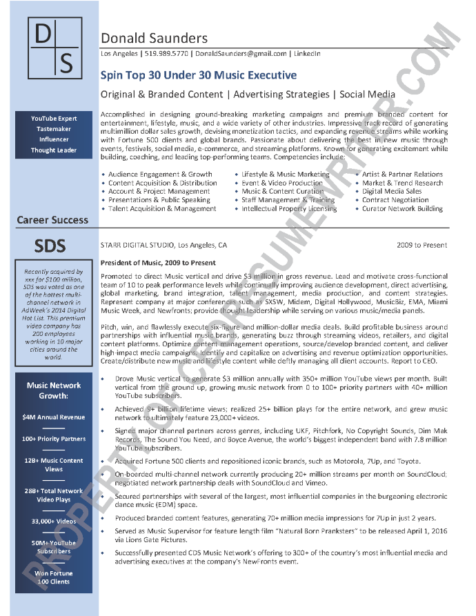 Written for a senior executive seeking a position as a Chief Executive Officer (CEO), or President for the music and entertainment industries. This sample executive resume was written with an emphasis on marketing, digital marketing, social media, advertising strategies and branded content.