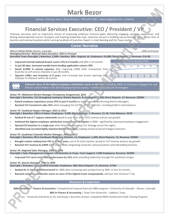 This executive resume sample is a one page overview of career success and brief narrative. The focus is on employee engagement, turnaround leadership roles and customer engagement for large, multi-billion-dollar financial / banking institutions. Often board of directors, CEO’s and executive recruiters prefer single page resumes when being introduced to a candidate for the first time.