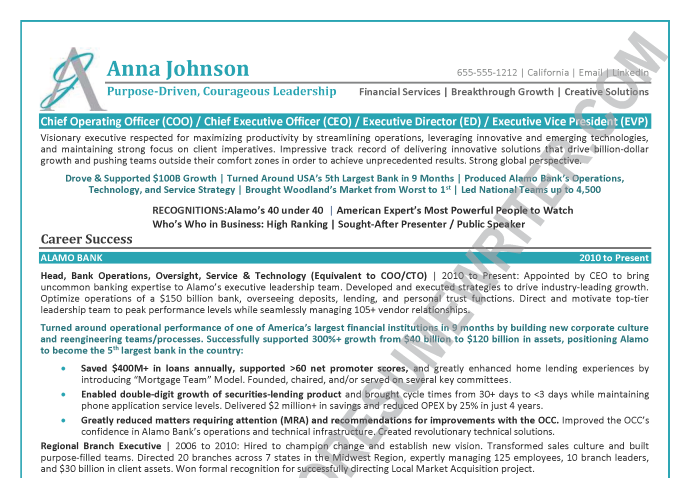 Reviewing these samples clarifies why you should have a certified top executive resume writer write your c-level resume to capture your unique value.