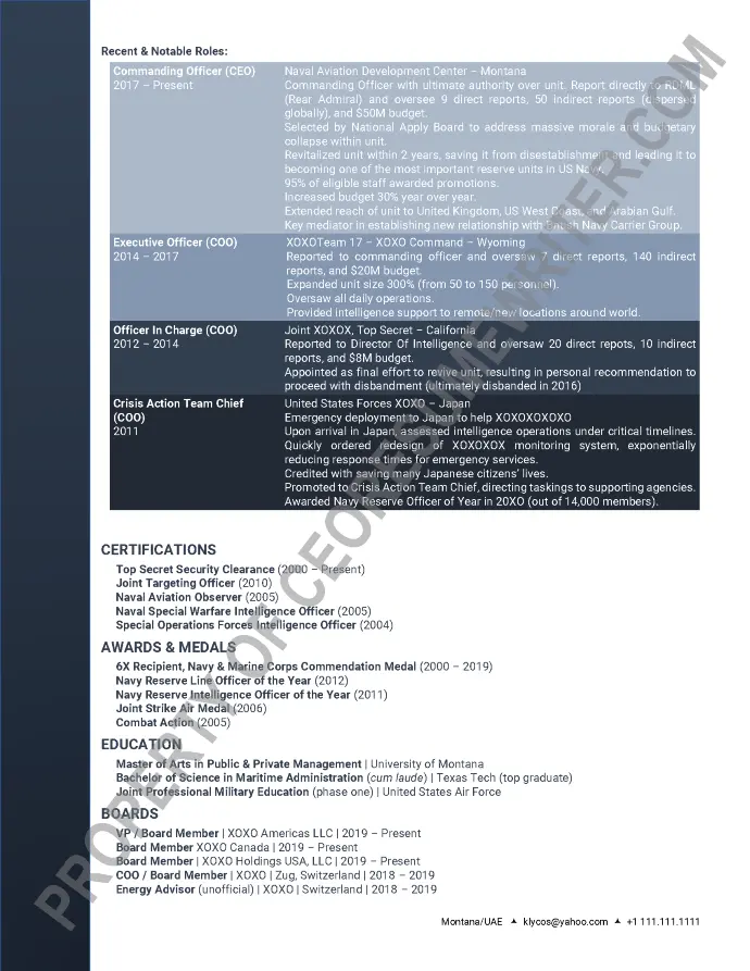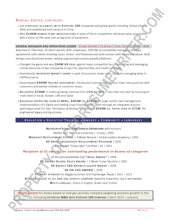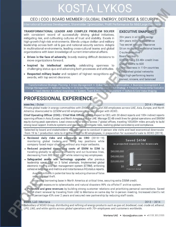 Executive board resume sample written for a senior executive seeking additional paid board appointments, CEO or COO roles in the energy, defense, security and oil and gas industries. This sample resume emphasizes leadership skills in transformation strategic planning and crisis management.