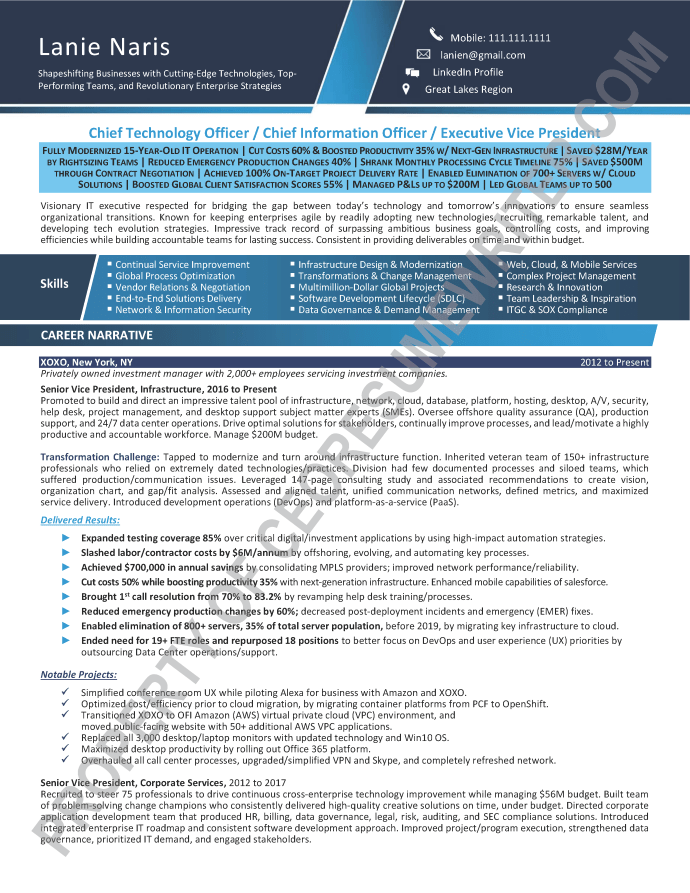 Written for a senior technology executive seeking a position as a Chief Information Officer/CIO or Chief Technology Officer/CTO for premier global companies in the finance and banking industries. This technology executive sample resume was written with an emphasis on enterprise strategies and leading infrastructure transformations.