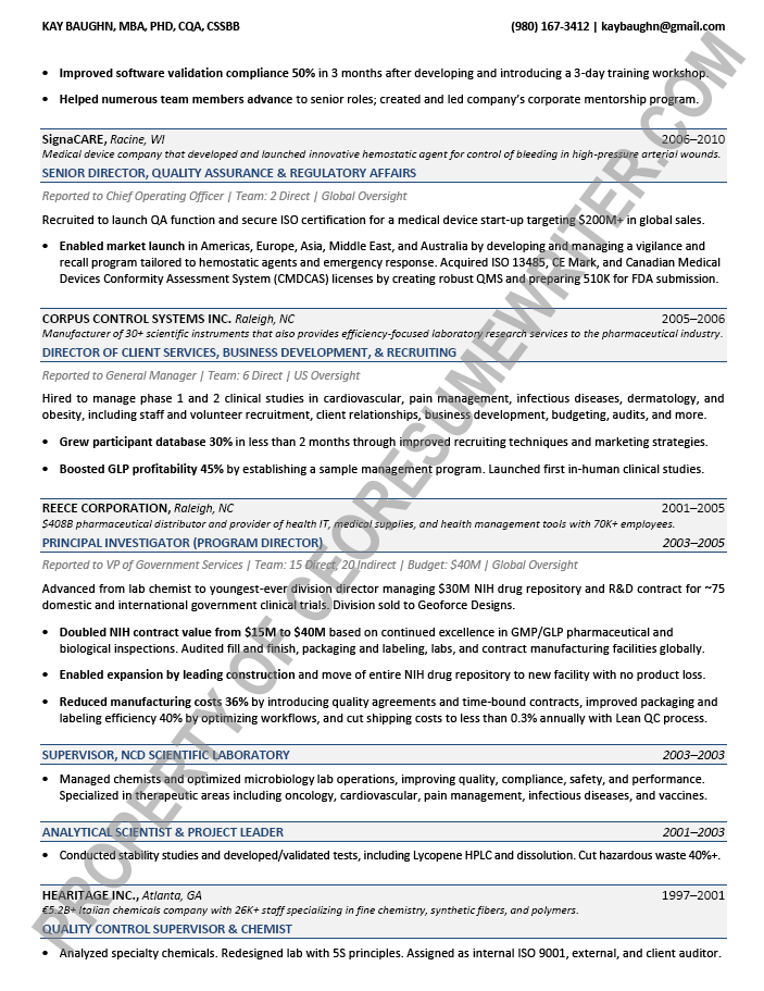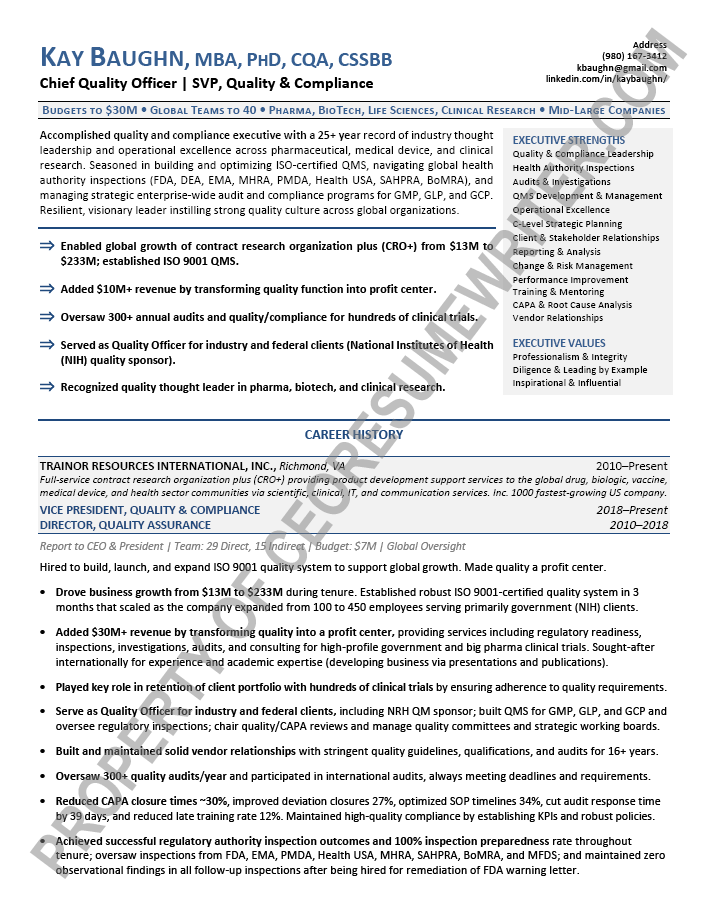 Written for an executive seeking a position as a Chief Quality Officer. This executive resume sample was written with an emphasis on global teams, pharma, biotech, life sciences, and clinical research for mid-sized to large companies.